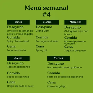Lunes Desayuno: Omelette de jamón de pavo y crema de chipotle Comida: Spicy chicken bowl Cena: Taco vietnamita Martes Desayuno: Grand slam Comida: Pechuga marinada Cena: Spring roll Miercoles Desayuno: Chilaquiles rojos con huevo Comida: Pasta al pesto con camarón Cena: Taquitos de queso Jueves Desayuno: Toast mediterráneo Comida: Sopes de cochinita Cena: Onigiri de pollo al curry Viernes Desayuno: Hot cake de avena y plátano Comida: Filete de pescado a la plancha Cena: Ensalada griega